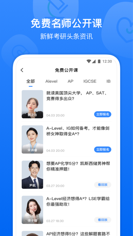 【藤校&G5名师公开课】每周邀请毕业于藤校&G5的名师,在线免费分析各科学习经验以及大考高分技巧,同时结合学生成绩特点,推荐适合的国际学校,帮助学生精准规划和定位留学方向。