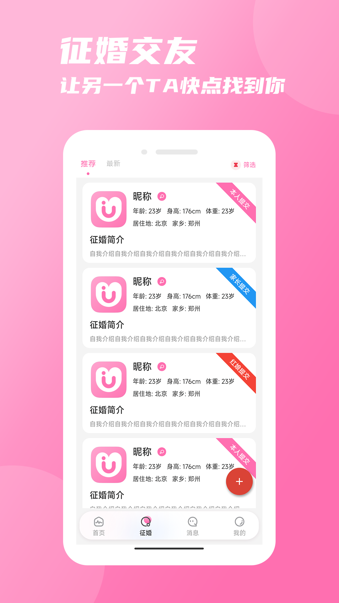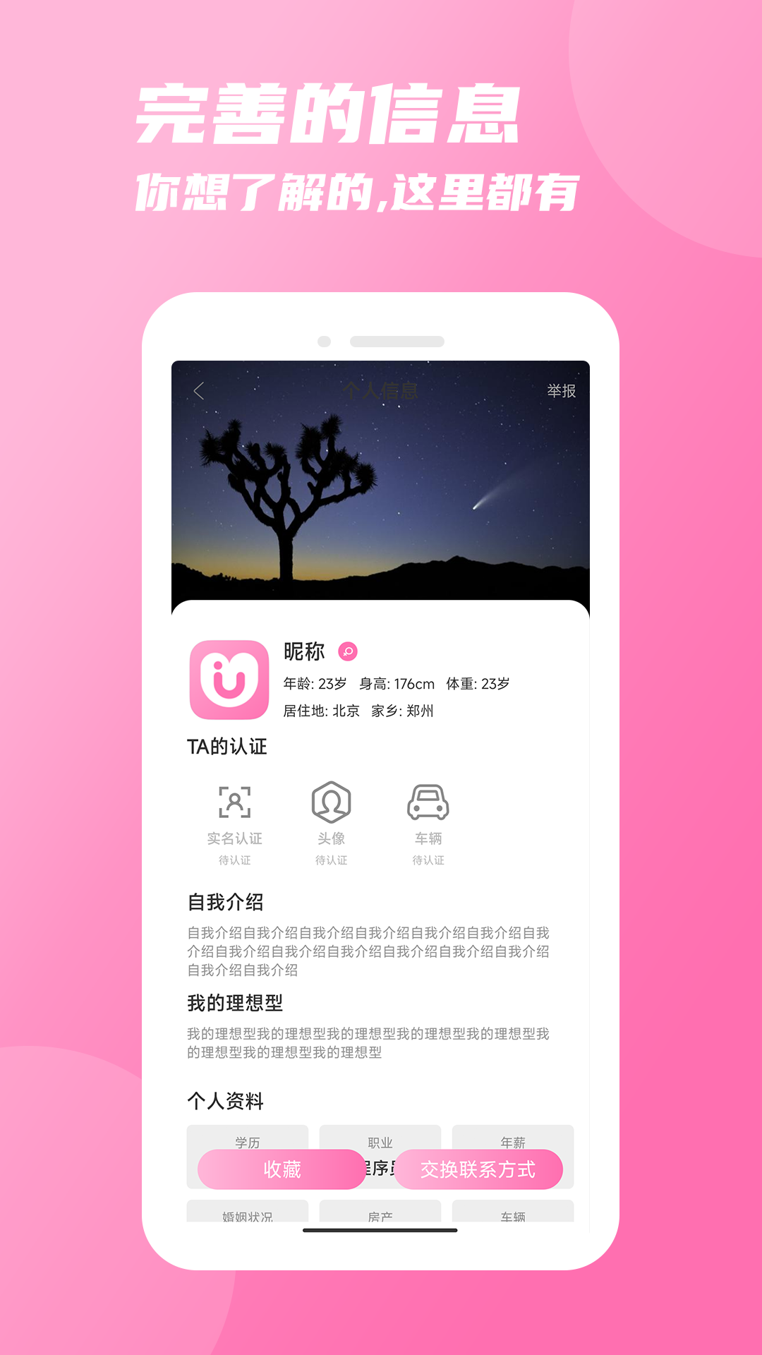 友你是一款征婚交友APP,在这里,你可以把你的真实信息登记下来,系统会根据您的信息,为您匹配*合适的TA,友你集交友、恋爱于一身,通过在线匹配,解决陌生人社交破冰难题,打造更真实的恋爱社区。