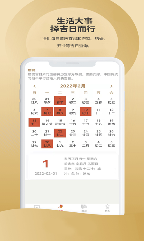 吉祥星事历APP是一款通过解决爱情婚姻、职场事业等人与人之间关系处理、沟通困惑等问题,从而帮助用户提升个人生活幸福度的实用性APP。以中国传统黄历文化为基础,结合人们的现代生活量身打造,用以丰富人们的精神文化生活,创造更和谐、美好的人生。