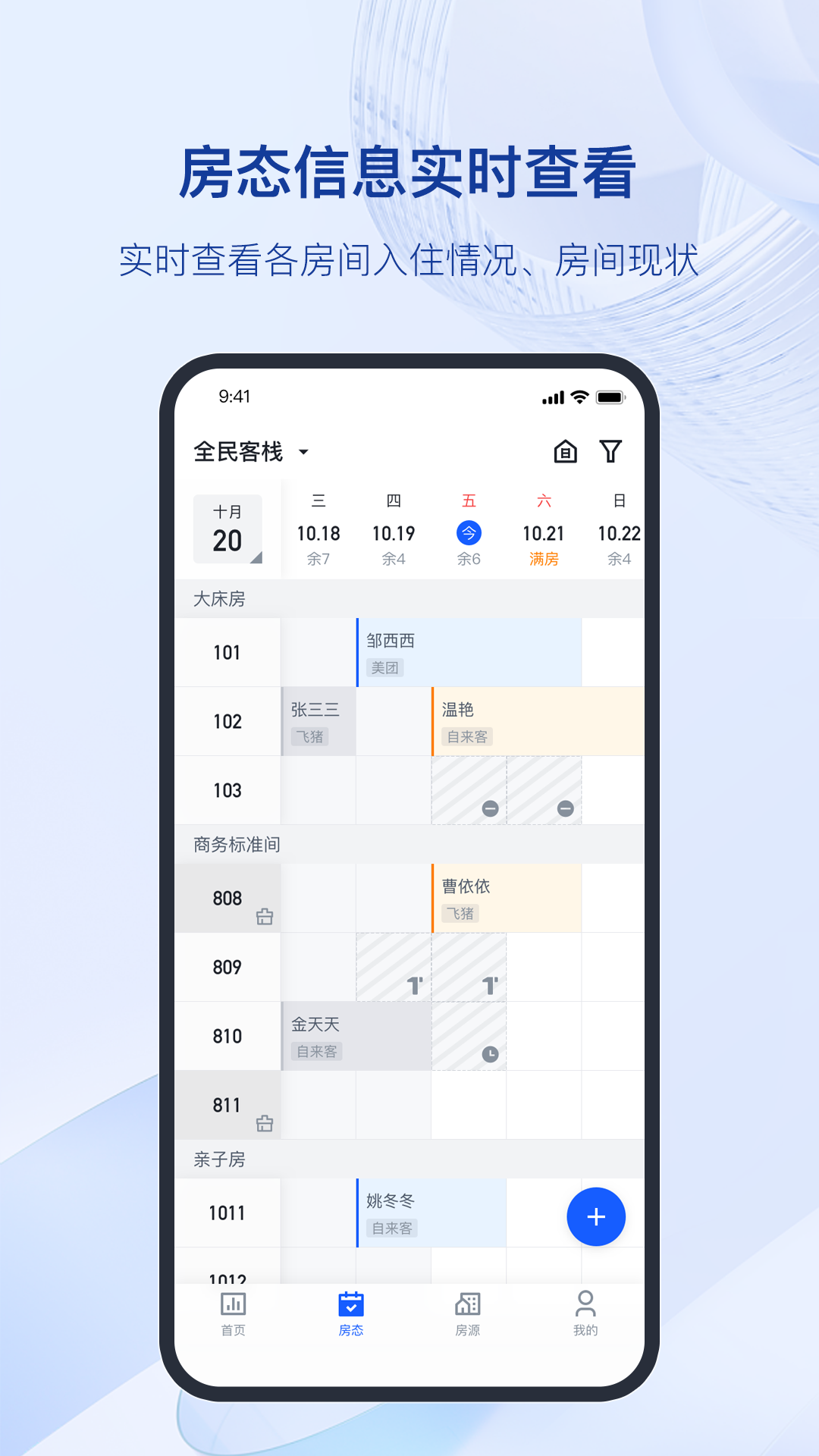 自动统计入住率、以及今日/明日的入住/退房订单等多项指标,便于日常管理