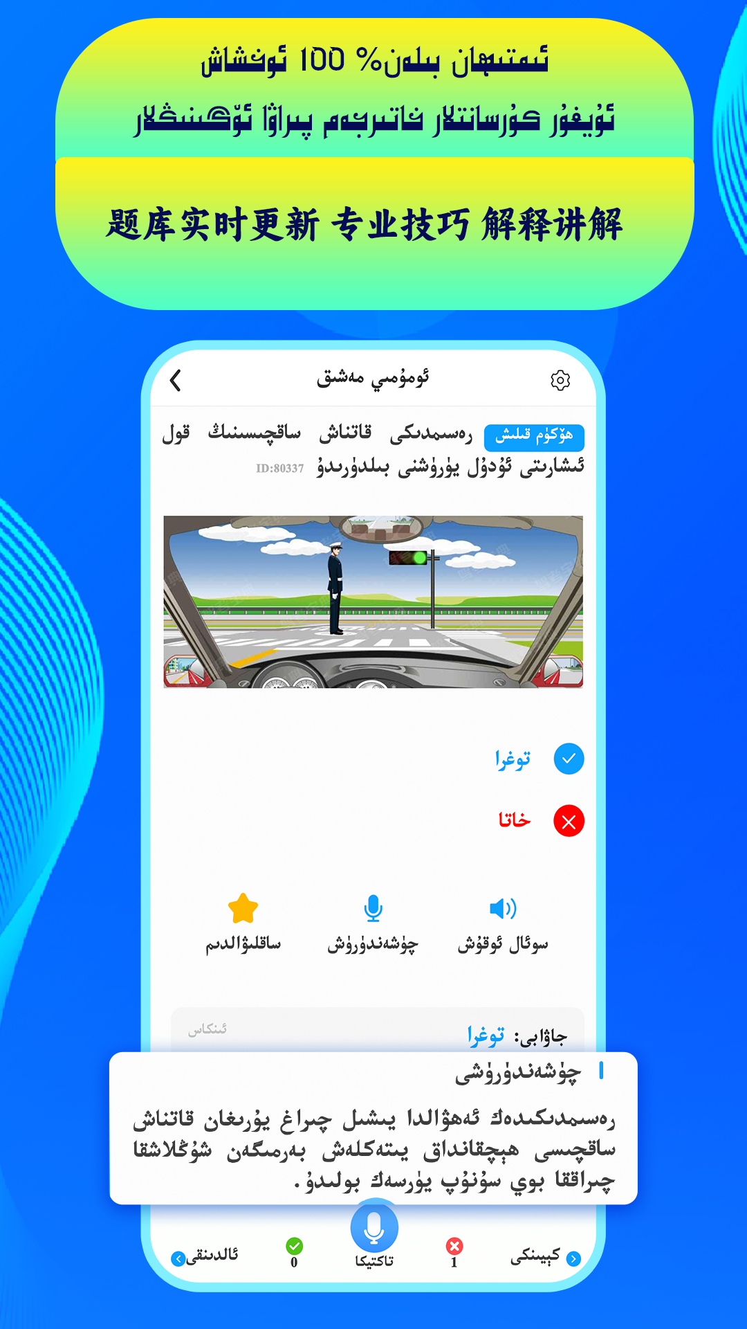 通用驾驶证考试APP是上海阿拜科技有限公司开发的一款驾驶员模拟考试软件。通用驾考可运行在安卓、苹果、微信小程序上使用的一款多语言app、语言包含:汉语,哈萨克语,维吾尔语等语言、以图片+文字+视频的方式、直观详细地讲解驾考知识。通用驾考采用新版全国标准题库。首创以图片展示+文字讲解+视频演示的方式、直观详细地讲解驾考知识。 学员可以通过设置车型来备考A2 B2、A1A3B1、C1C2C3、DEF类驾照,学习科目一、科目四理论考试,及科目二、科目三路考考试。