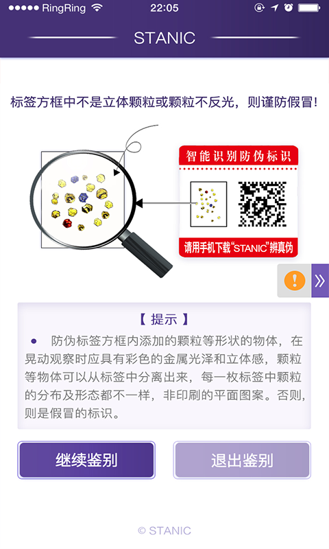 STANIC App能快速、准确地对STANIC防伪标签进行鉴别。STANIC是一家立足于现代信息产业,专注数字化防伪技术研究推广,为客户提供个性化防伪及信息服务的高新技术企业。