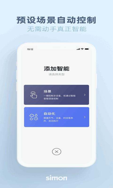 通过西蒙智享 App, 你可以方便地管理家中的每一个西蒙智能硬件, 查看运行状态,更改设置参数, 灵活定义场景配置, 管理家庭用户及权限, 让你的智能家庭与众不同, 为你, 更懂你。