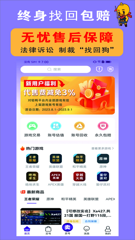 轻鸭代售App是覆盖手游、端游、国际游戏等全类游戏交易软件,提供买号、卖家、账号回收、账号评估、等一系列专业游戏服务。
