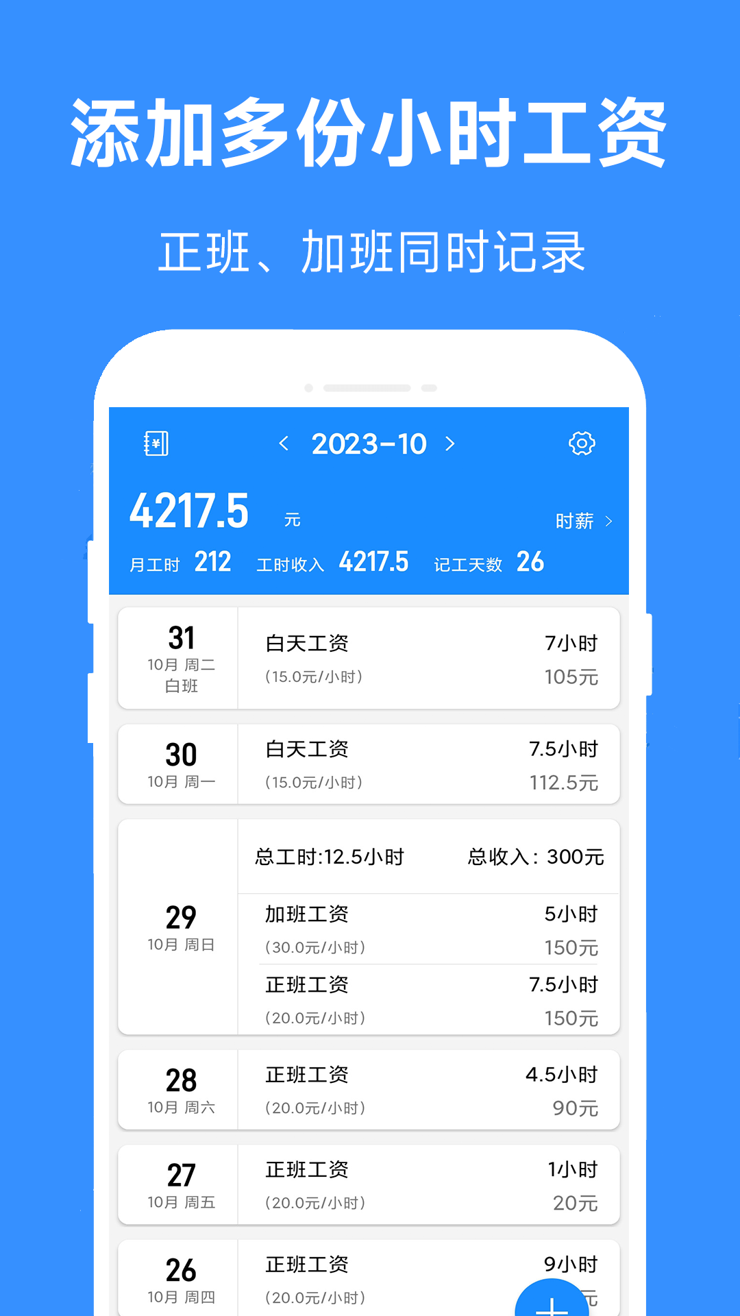 1、快速记工时:设置好小时工资后,每天记录工时,就可以自动帮您计算工时收入