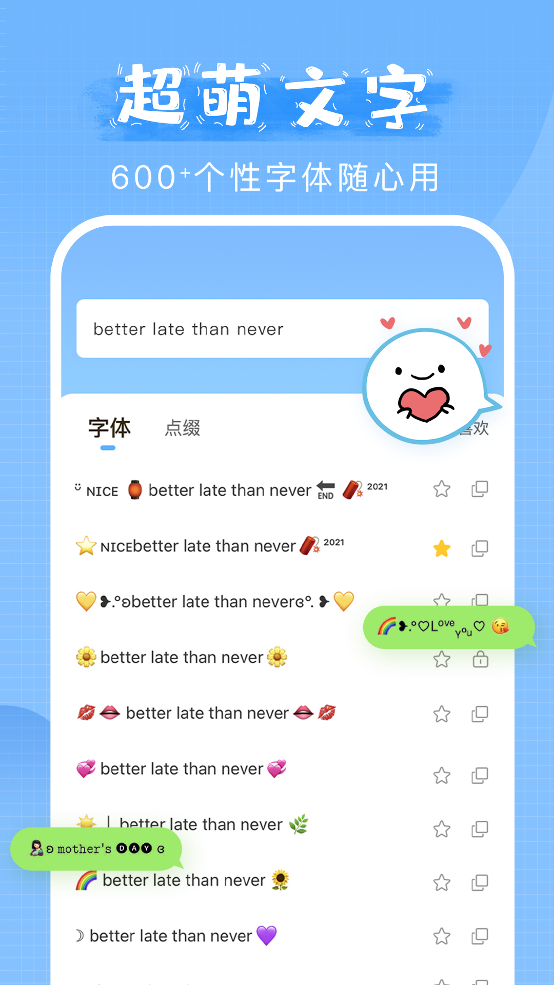 提供了丰富的花样字体,文字装饰,特殊符号,颜文字表情等。