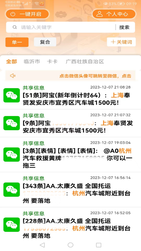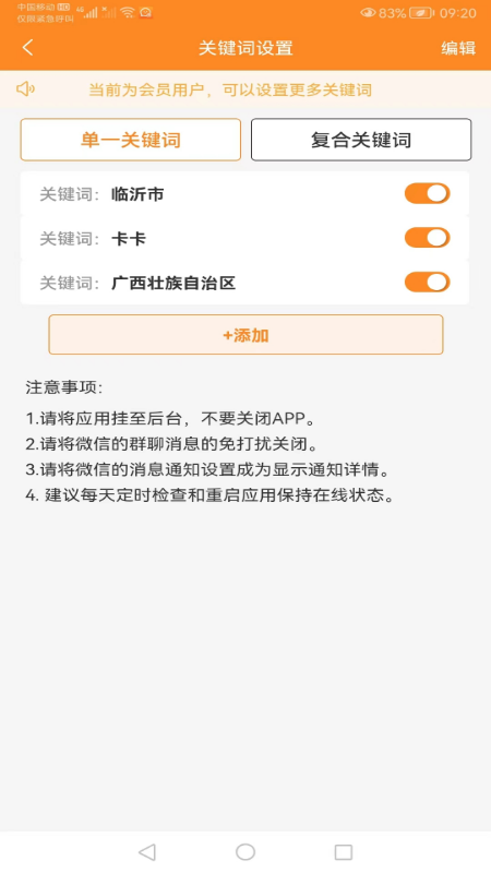 一款针对手机关键词的提醒工具,无需手机Root,直接安装即可使用,设置关键词,开启服务,即可在众多的微信信息中,接去除涉及到您的关键词的语句,时间以及发言的群名都可以截取出来