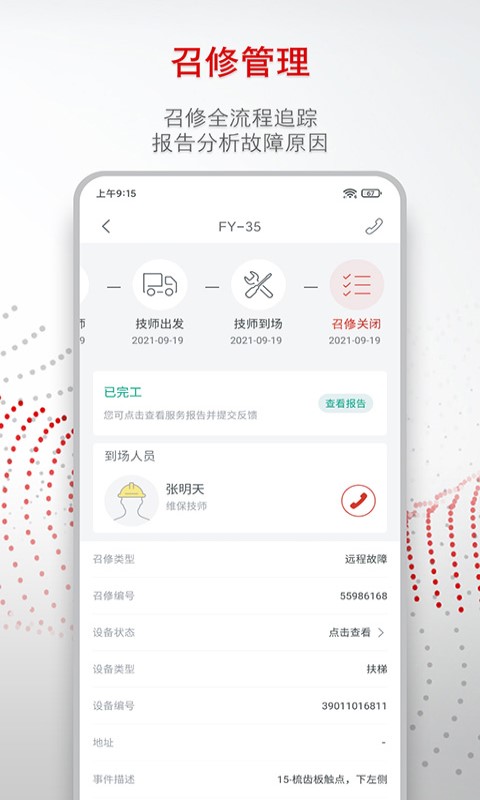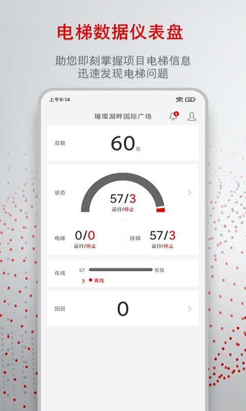 迅联管家APP提供:1.项目设备健康状态总览;2.项目设备物联网连接状态统计;3.项目设备资产清单;4.实时电梯扶梯运行状态查看;5.故障事件通知;6.回召服务追踪;7.维保计划查看;