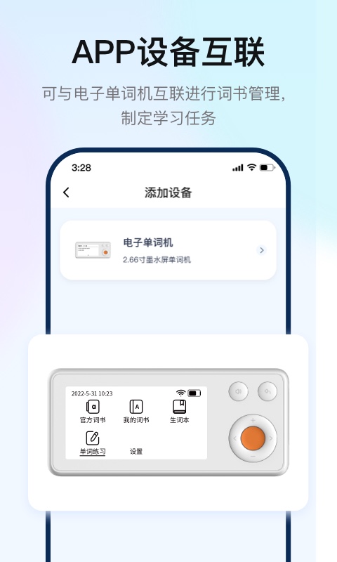 购买单词机后,根据提示信息,通过APP扫描设备上的二维码完成设备绑定和配网,与电子单词机等设备建立连接