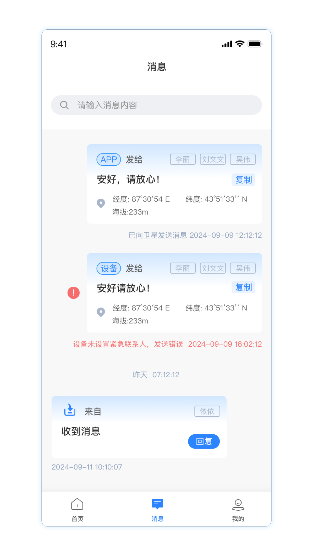 千寻信使App配合通讯器使用,可在无网络信号覆盖的户外区域发送及接收卫星消息,时刻畅联,保障安全