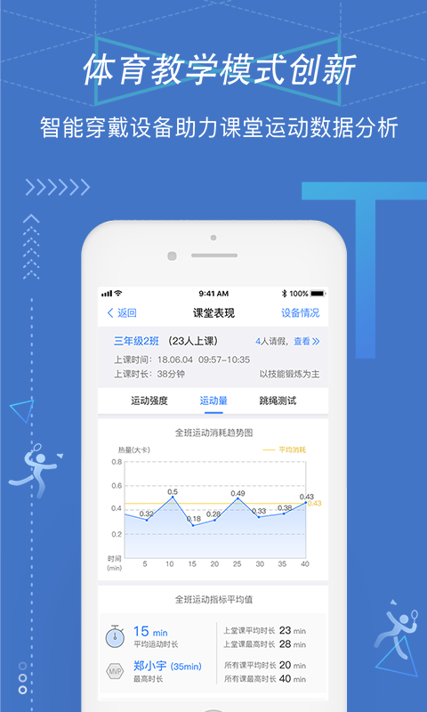 2、智慧体育课堂:创新体育教学模式,配合使用智能穿戴设备,完成课堂运动数据自动收集与分析;
