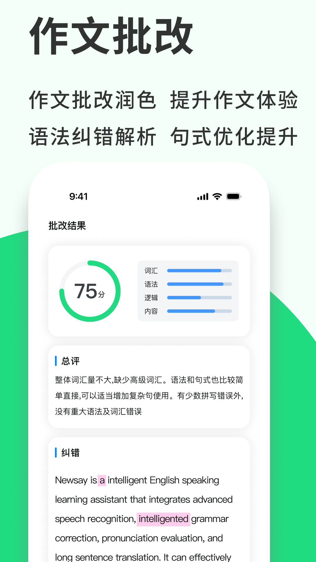 作文批改润色,语法纠错解析,句式优化提升。