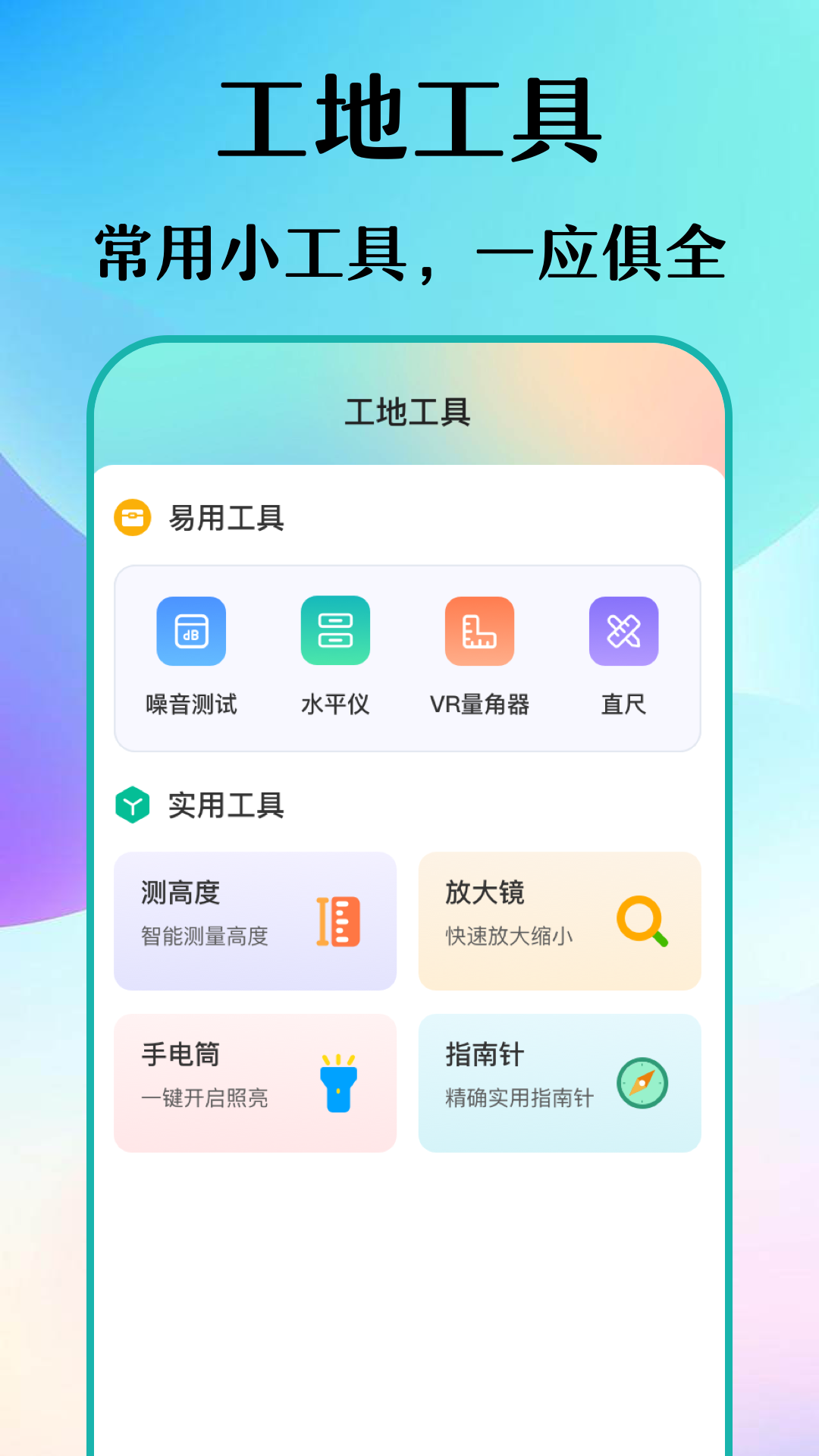 工地工具:涵盖了噪音测试,水平仪,量角器,直尺,手电筒等多种工具,让您的手机秒变工具箱