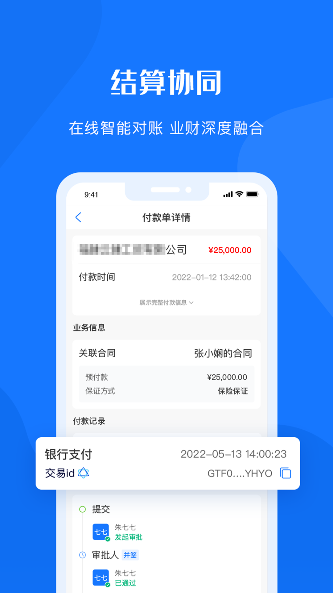 支持采购订单、到货通知、采购收货、采购退货等采购业务协同和应付结算单、付款单、进项发票、供应商账单等采购往来账功能,实现采购全流程在线化操作。