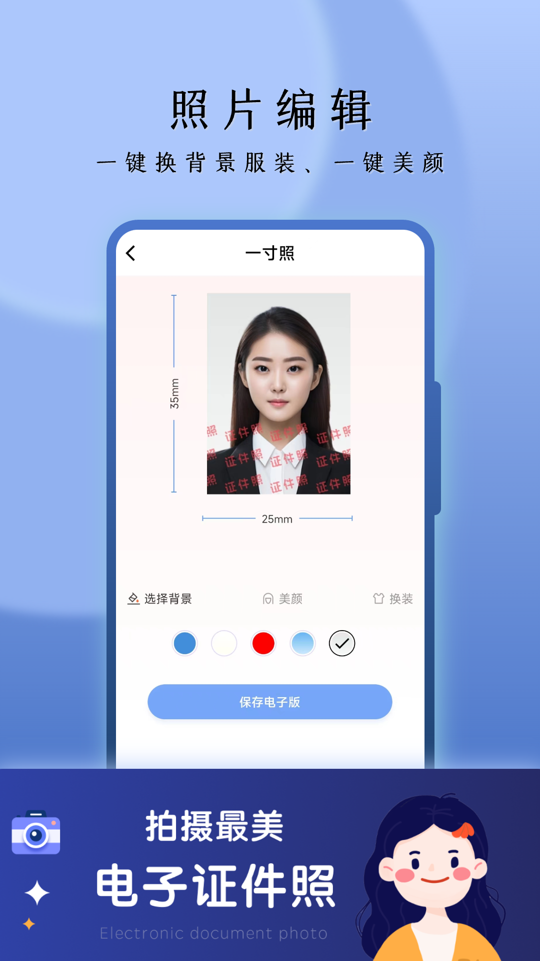 这是一款功能齐全的电子证件照制作软件,可以随时随地制作精美的证件照,不用担心出现紧急时候没有证件照的尴尬情况!