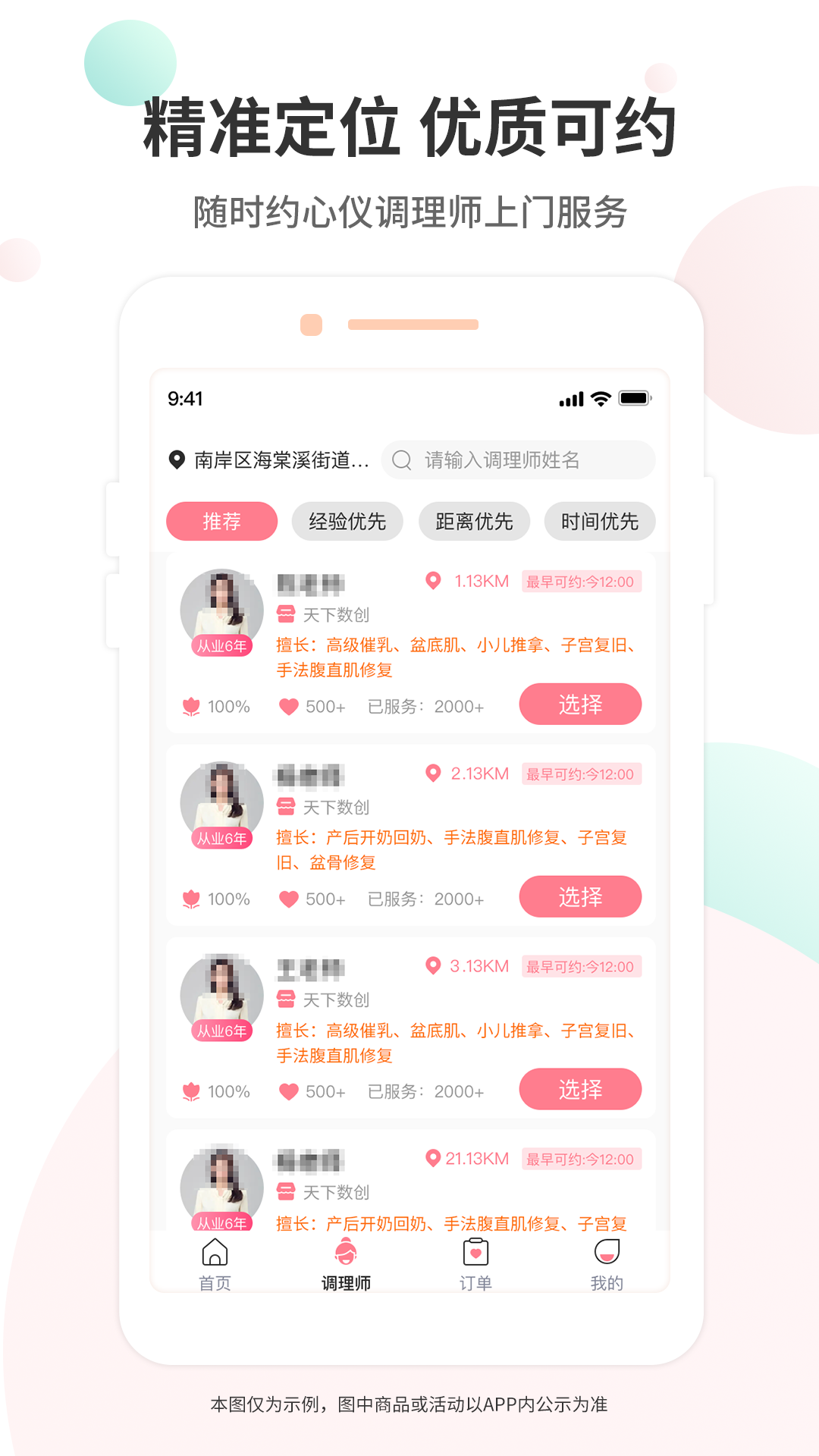 只需1分钟便可预约专业调理师上门为您服务。无论何时何地,我们都以能为您提供安全、舒适、专业、便捷、贴心的服务为目标。