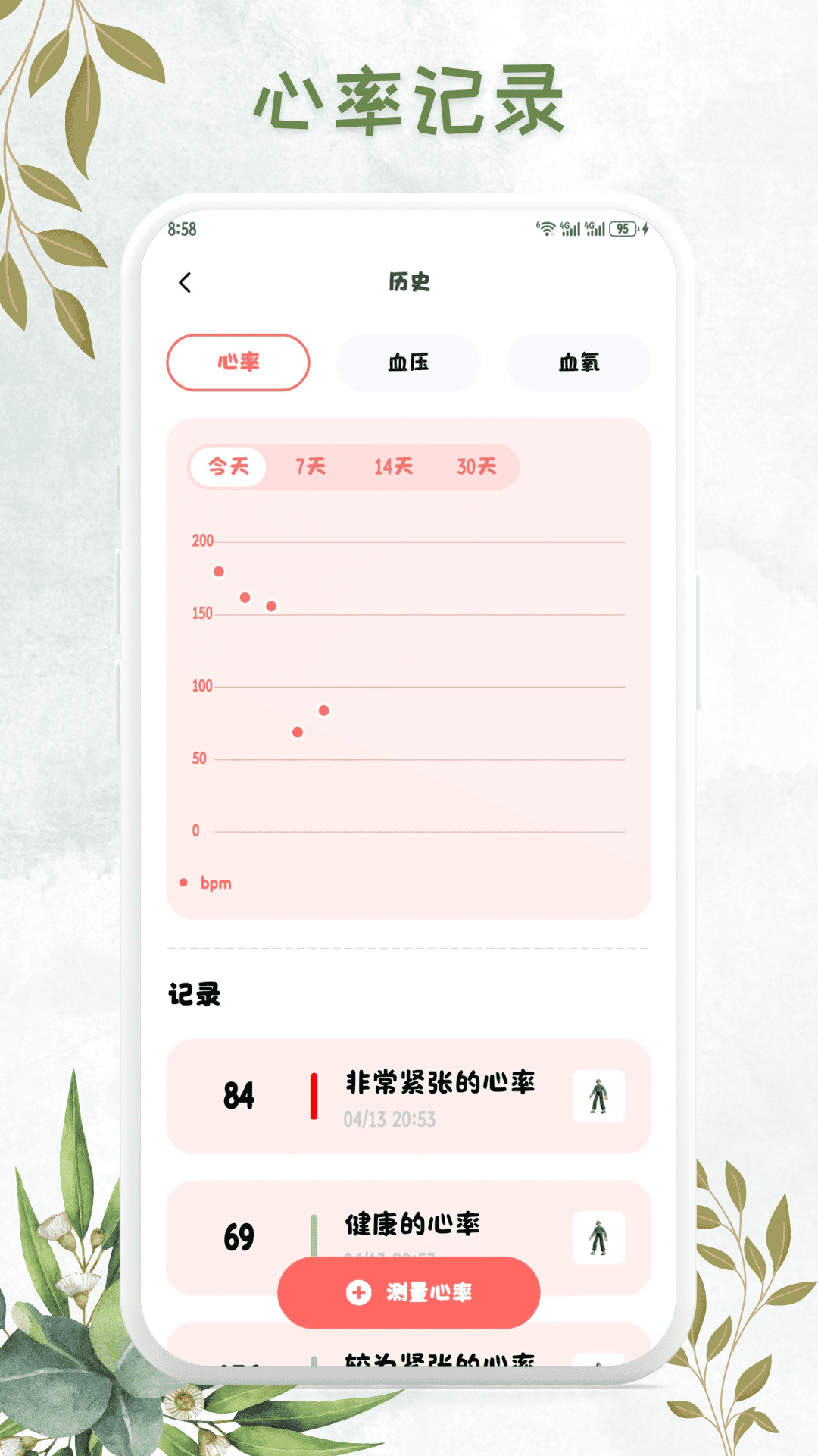 建议您每天使用「心率检测 - 心跳脉搏检测&血压血氧结果记录」来测量您的心率或记录您的血压。帮助您实时跟踪心率趋势,以更好地了解您的身体状况。