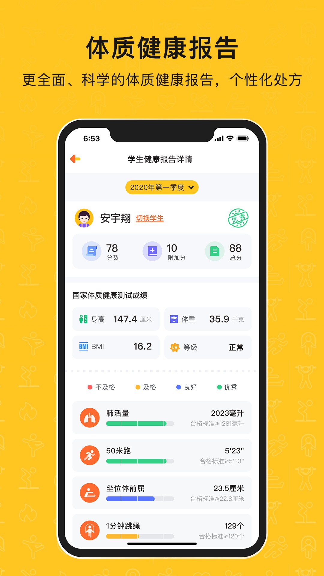 利用AI识别技术,只需一部手机即可进行多项体测体考相关运动锻炼,如跳绳,仰卧起坐,俯卧撑等项目,并实时反馈结果,形成运动记录。智能与趣味相结合,达成每日运动目标,定期生成身体数据报告。