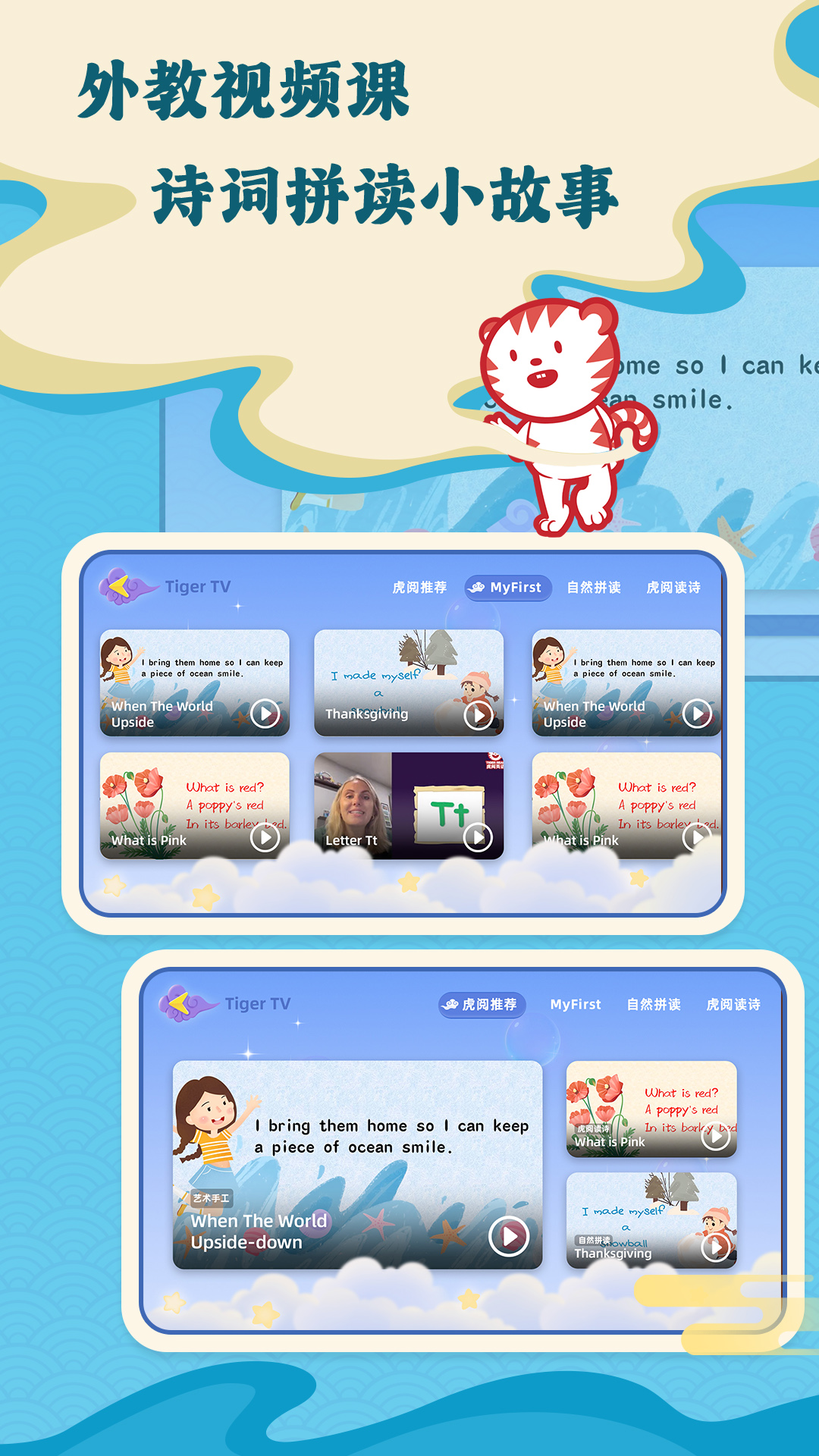 App内包括超过400节外教视频课,专业的欧美外教+中教组合课堂素质与成绩双提高,包括古诗讲解,自然拼读,寓言小故事等。提供孩子的全学科阅读题材,通识教育,全球视野。