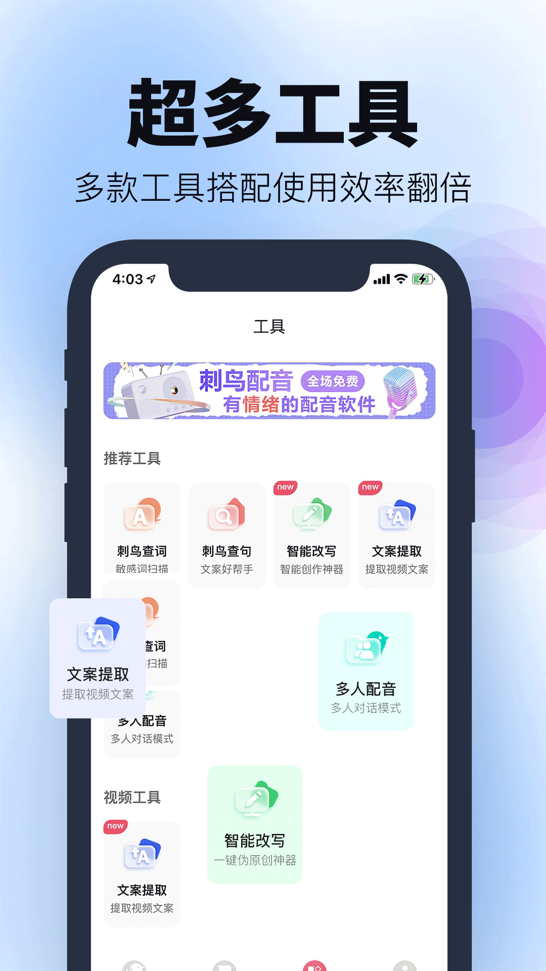 3、超多工具:文案提取、智能改写、多人配音等,多款工具搭配使用效率翻倍;