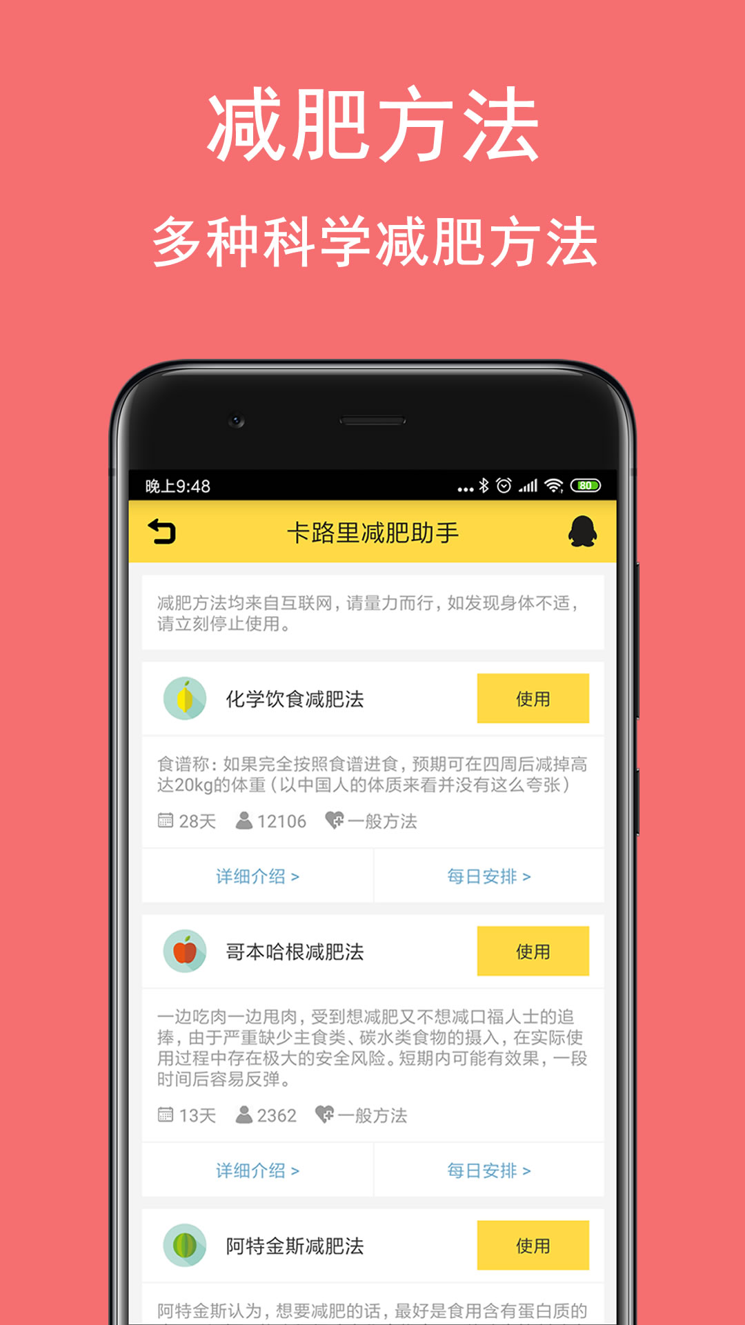 - 精选多个当下热门的减肥食谱,包括轻断食减肥、21天减肥法、哥本哈根减肥法、化学饮食减肥法、军方减肥法等。