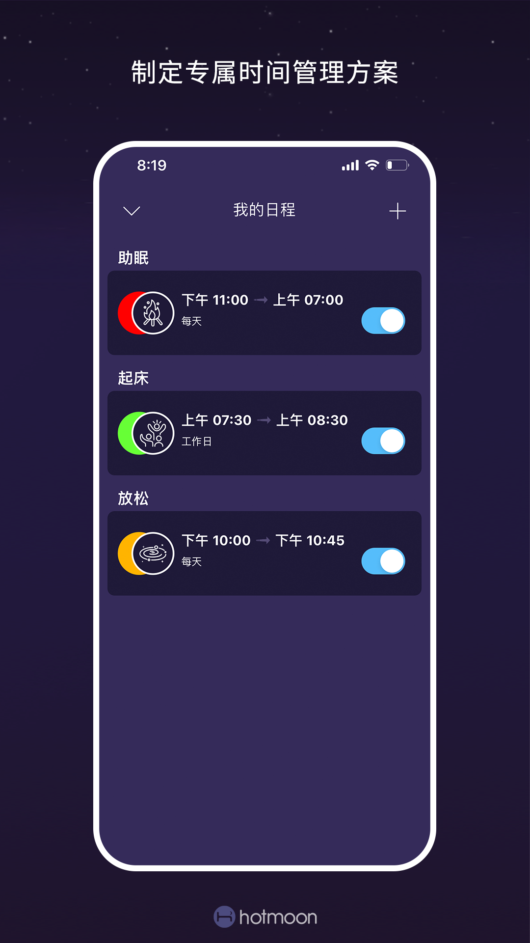 Hotmoon致力于通过智能硬件和优质内容为用户提供睡眠辅助、心理疗愈、冥想练习、心灵提升等综合解决方案。结合前沿的睡眠健康知识、专业的内观正念冥想方法和一流的智能硬件技术,Hotmoon提供可以个性化定制的声光疗法,帮助人们改善睡眠健康,缓解压力焦虑,消除负面情绪,提升心灵觉知。