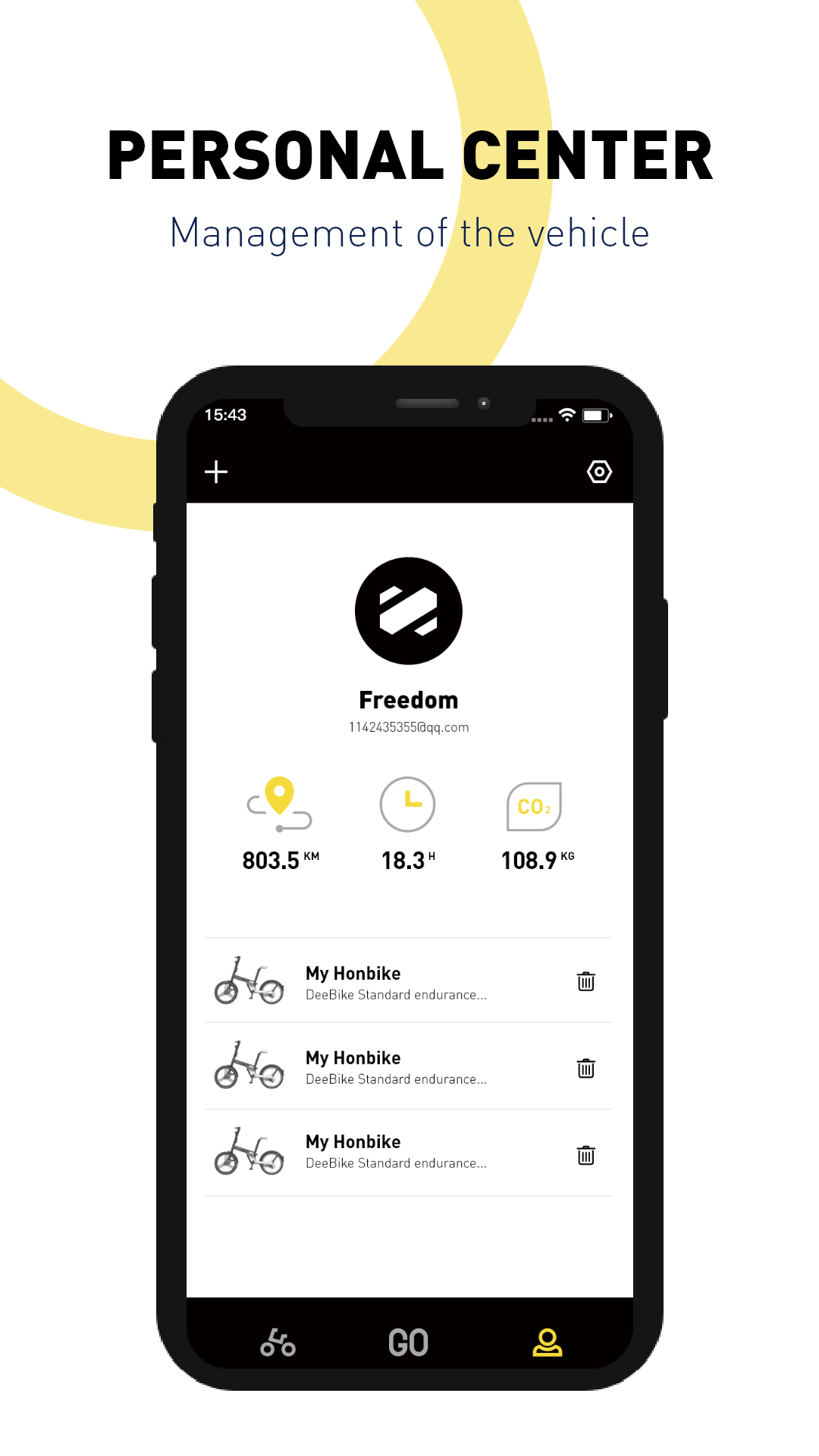 个人中心,包含我的骑行数据和我绑定的车辆设备。