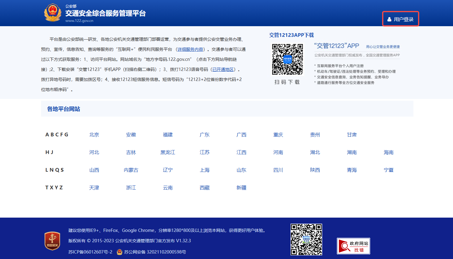 网页版依托公安部互联网交通安全综合服务管理平台搭建,各地使用独立域名,格式为:“地方字母码.122.gov.cn”