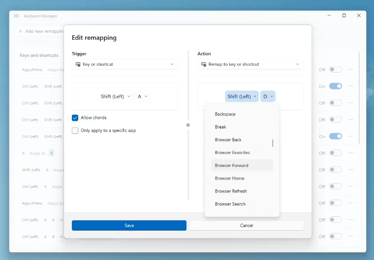 键盘管理器编辑器现已支持手动编辑已录制的按键映射,所有按键均改为下拉菜单选择模式,还可选用实体键盘上没有的按键。