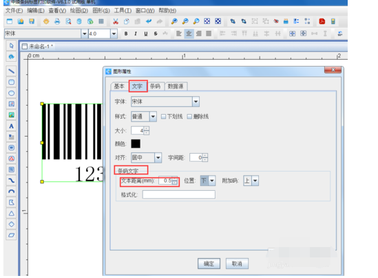 3.点击软件左侧的”实心A”按钮,在画布上绘制一个普通文本对象,双击普通文本,在图形属性-数据源中,点击”修改”按钮,数据对象类型选择”数据库导入”,在字段中选择相应的字段,会出现对应的内容,然后点击编辑-确定。